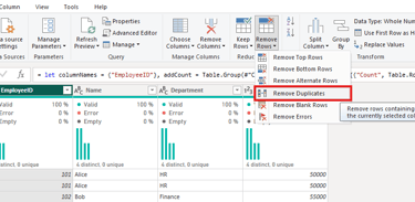 3. Power Query will keep only the first occurrence of each duplicate and remove the rest.
